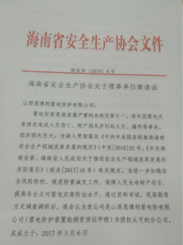 【概要描述】經(jīng)過資料審核、現(xiàn)場勘查等方式,海南省安全生產(chǎn)協(xié)會授權(quán)山西恩博利雷電防護(hù)有限公司海南分公司為海南省安全生產(chǎn)協(xié)會理事單位。其職責(zé)是遵守海南省安全生產(chǎn)協(xié)會章程,積極配合海南省??谑邪踩a(chǎn)監(jiān)督單位,做好區(qū)域內(nèi)雷擊安全隱患排查工作和雷電災(zāi)害防御宣傳工作,為防雷減災(zāi)提升全民雷電災(zāi)害防御意識做貢獻(xiàn)。山西恩博利雷電防護(hù)有限公司海南分公司于2017年3月成立以來,以防雷減災(zāi)為己任,結(jié)合海南雷電防護(hù)工作實(shí)際,與區(qū)域